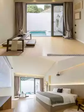The room blew me away! Wabi-sabi style decor totally vibes with my taste, full smart-home convenience, and the bed is so plush I never want to leave. Step outside, and there’s the pool—crystal clean with daily water changes! My kid splashes around while I chill indoors with AC and coffee. Parental freedom unlocked!
