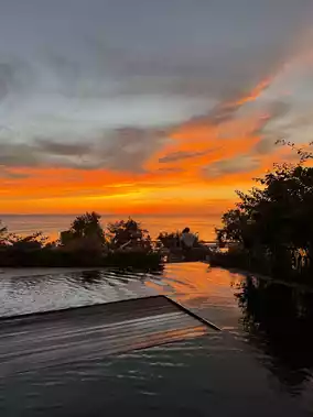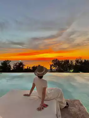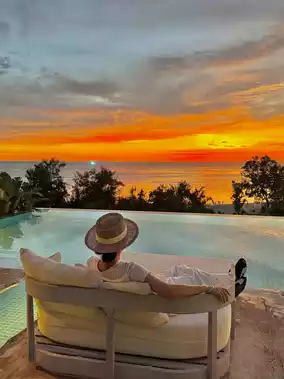 Private swimming pool, sunset terrace, sea-view soaking tub, floor-to-ceiling windows with evening glow.