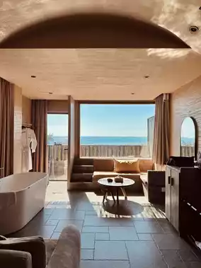 Here, there's no need to squeeze into crowded beaches. Simply pour yourself a glass of champagne in a 270° sea-view room and enjoy an exclusive "ocean light show." The room even features a soaking tub where you can relax while watching the sun dip below the horizon, with every detail exuding a sense of pampered happiness.