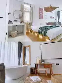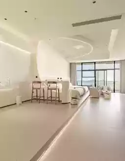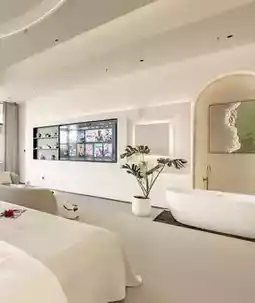 The pure white minimalist building stands quietly by the coastline, like a giant art installation. The moment you step inside, you’re struck by the aesthetic full of order—the cave-like walls engraved with the texture of time, the warm and simple furniture, and the most stunning feature: the 180°-270° wrap-around floor-to-ceiling glass windows that turn the entire sea into a dynamic mural for the room🖼