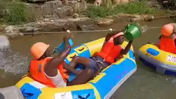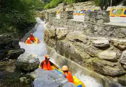 Tourists riding rafts travel through mountain waterways and lakes, experiencing the tension, excitement, and joy brought by mountain drifting.