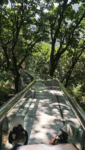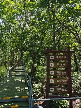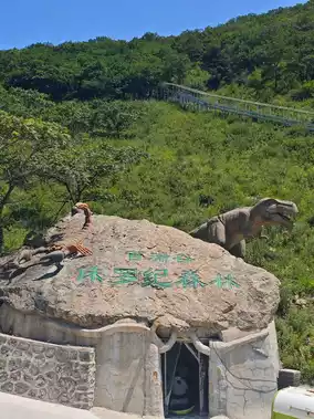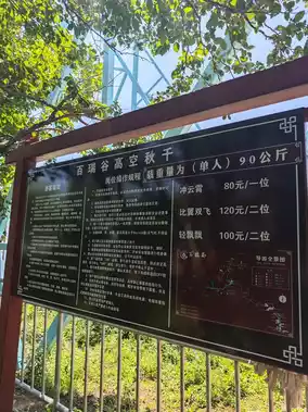 At the top of the mountain, there is a high-altitude swing. The price is as shown in the picture, and it feels quite high and thrilling. Moving forward, there is a glass platform that is great for taking photos. Continuing along the path, there is a high-altitude zipline, which we did not try. Further along, there is a jungle slide for 30 yuan per person. You wear pants, shoe covers, and gloves, and control your own speed. It takes about 3-4 minutes to slide down, and you will arrive at the entrance of the Jurassic Forest.