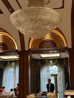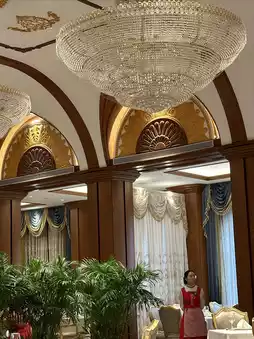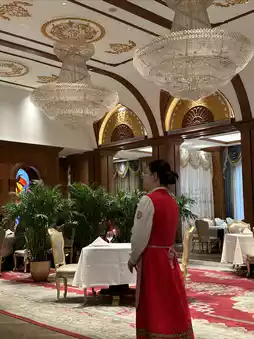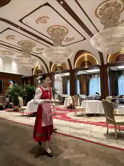 Walking up the stairs along the long and narrow corridor, rich aroma wafts in from under the glass door. The dining table is set with porcelain sculptures of little foreign children and cartoon bears, the walls are painted with rich Chinese-style paintings, and there is a crystal chandelier hanging from the ceiling...all of this is full of obvious Russian style.