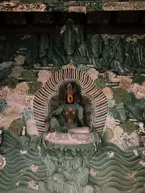 The central temple area includes the mountain gate, stele pavilion, merit pond, bell and drum tower, Heavenly King Hall, Mahavira Hall, Amitayus Hall, Great Compassion Hall, Relic Pagoda, Dragon Pond, Dragon King Hall, etc. It is the core area of Dajue Temple.
