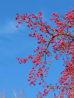 It grows in a corner of the parking lot in front of the Yingbin Building of the Beijing Friendship Hotel. This Malus spectabilis is particularly tall. Despite the blue wind warning in Beijing for so many days, the crabapples on the tree have not been damaged much and are still firmly hanging on the branches. This shows how strong and vigorous their vitality is.