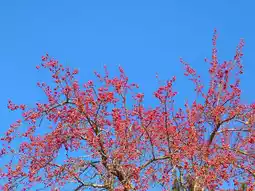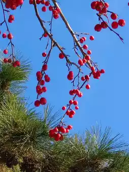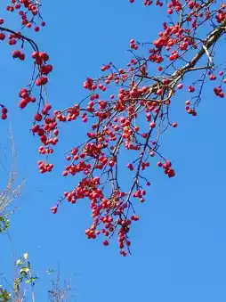 This Malus spectabilis is covered with crabapples. Standing under the tree and looking up, the red fruits against the blue sky are so splendid, so flamboyant, and so lovely.