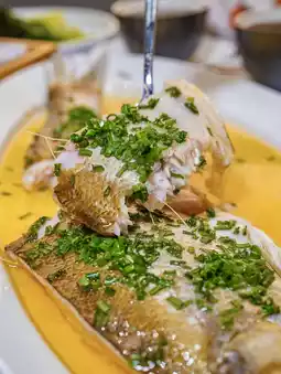 The white fish is delicate and tender, and the golden chicken juice is extremely delicious. The fish meat absorbs the freshness of the chicken juice and the fragrance of flower wine. It is tender and delicious. The steaming method can taste the original flavor of the fish meat.