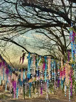 A sea of purple flowers in the snow, and colorful flower vines swaying on the branches