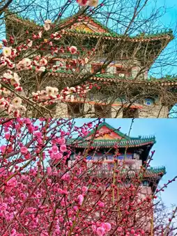 Overlooking from the City Wall: Climb the city wall and use the battlements as the foreground. Use a telephoto lens to capture the winding paths and scattered plum blossoms in the garden, perfectly blending a sense of history with natural beauty.