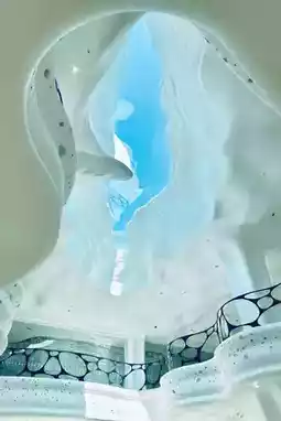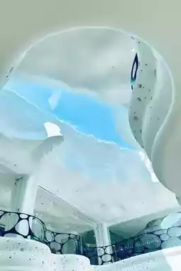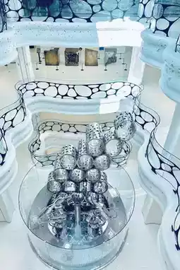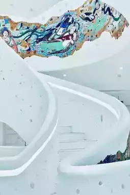 - The building's exterior is primarily pure white, resembling a giant cave, with a translucent glass roof that lets in natural light.