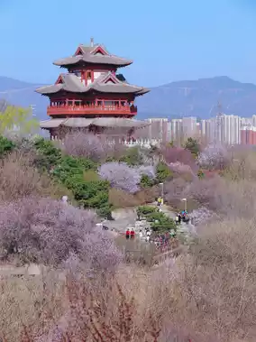 When visiting the Beijing Garden Expo Park in early spring, you can skip other places, but you must visit Peach Blossom Valley. At that time, the valley is filled with the fragrance of peach blossoms, with shades of deep and light red captivating hearts. The distant Wenchang Pavilion echoes the blossoms, creating a scene of otherworldly beauty.