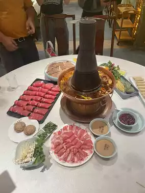 The unique feature of Beijing hotpot is that it is a tall pot, mostly made of copper. As in the picture, we ordered a set for 2 people. At first, the staff said that it would not be enough because there were 5 of us, so they suggested ordering more. But when it was full, it was as shown in the picture. We could hardly finish it. 🤣