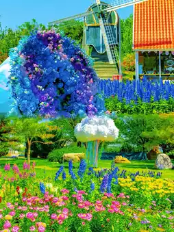 ◦ A giant hydrangea terrace at the north gate entrance, featuring pink bows🎀 and cascading floral waterfalls. Perfect for low-angle shots or overhead panoramas to highlight the blue-purple hues of 'Endless Summer'.