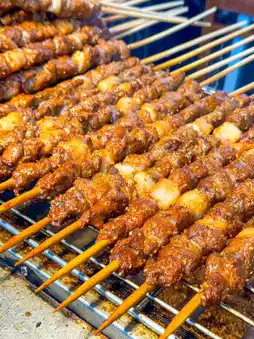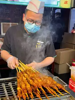 Wandering down the historic pedestrian avenue, with its stone-paved walkways, traditional Chinese facades, and fluttering red flags, I got swept into a food lover’s dream. The air was rich with the smell of grilled meats and spices. That’s when I spotted a stall with a small queue — always a good sign.