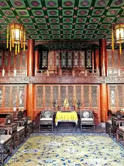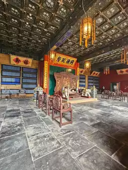 The architectural masterpiece is tall and majestic. There are exquisitely carved golden nanmu partitions in the hall, which were built by Heshen in the style of the Ningshou Palace in the Forbidden City.