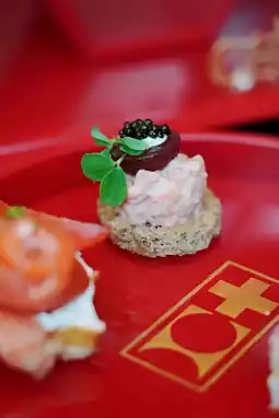 The red afternoon tea stand echoes Cellcosmet's packaging design, with its shape abstractly representing the hotel's architecture. The coffee features Cellcosmet's logo, accompanied by a specially crafted berry smoothie that's refreshingly sweet and tart. The lychee jasmine mousse offers silky creaminess, the seasonal sweetness of lychee, and a delicate floral aftertaste.