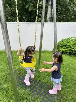 The courtyard features an outdoor pool 🏊, a slide 🛝, and a cloud swing ☁️.