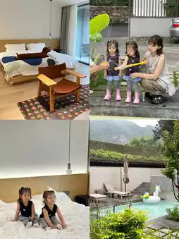 The rooms are designed with families in mind, catering to both aesthetics and practical needs. We stayed in a spacious double room with a private terrace on the second floor. The wooden furniture paired with warm yellow lighting creates a cozy and refreshing ambiance. The bedding is made of soft cotton-linen material, making it feel like sinking into a cloud. Kids can jump around without disturbing the neighbors below.