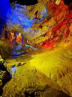 A 20m waterfall hides a karst cave behind it! Stalactites and stalagmites create a crystal wonderland under lights, with perfect rainbow photography at 4pm🌈.