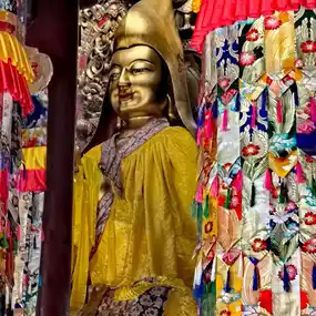 • Intricate architecture with bright red walls, golden rooftops, and richly detailed wood carvings.