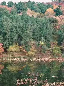 The autumn scenery of Jingcui Lake unfolds like a captivating painting. The mirror-like water reflects the fiery hues of the surrounding forests, where maple leaves blaze red, ginkgo leaves shimmer gold, and willow tendrils sway gently in the breeze. Strolling along the lakeside path, one gazes up at the kaleidoscopic mountain woods and down at the tranquil lake dotted with withered lotus leaves. This poetic harmony of sights soothes the soul, leaving visitors enchanted and reluctant to depart.