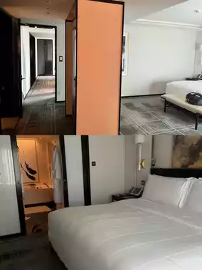 I stayed in a deluxe suite, with a huge 60 square meters of space! The entire room is controlled by iPad smart system, and even the bathtub is a custom marble design🛁 Even more amazing is the wardrobe with built-in lighting that automatically turns on when you hang clothes—this really understands women💡