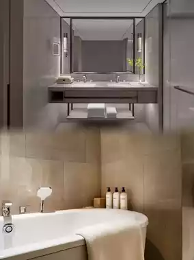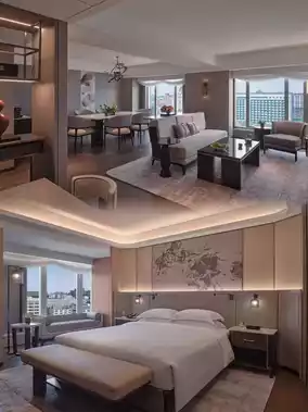 The hotel was created by an international team, with the lobby centered on "Oriental charm": a huge ink painting scroll hangs in the atrium, redwood furniture paired with modern lines, traditional coiled dragon carpets clashing with a bright gold leaf ceiling to create an aura of "understated luxury." Guest rooms blend Eastern and Western aesthetics, with large floor-to-ceiling windows bringing views of Chang'an Street or Oriental Plaza greenery indoors; the bathroom features a tropical rainforest-style shower, custom fragrances, and soft bathrobes, showing thoughtful care that feels like a "home away from home."