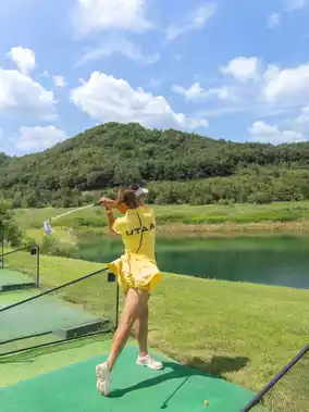 Swing the club, here the fun of water golf is watching the splash on the lake surface when the ball hits
