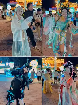 4. Hanfu Parade and Guochao Experience: A team dressed in gorgeous Hanfu (traditional Chinese clothing) parades through the park, with brilliant lantern lights complementing the costumes. In the Guochao Hundred Plays themed area, you can experience the collision of intangible cultural heritage charm and trendy culture.