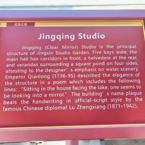 Jingqing Studio (meaning "Transparent Glass") is the main structure of Jingxin Studio Garden. The building spans five bays. The main hall has a corridor in front, a bell tower at the back, and balconies surrounding a rectangular pond on all four sides, reflecting the designer's emphasis on the water's beauty. The Qianlong Emperor (1736-1795) described the building's elegance in a poem: "Sitting in the house facing the lake, it's as if looking into a mirror." The building's nameplate bears the official signature of the renowned Chinese diplomat Lu Zhengxiang (1871-1942).