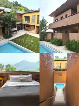The homestay has 9 rooms, each with a different view. The courtyard features a large swimming pool and a vast green lawn.