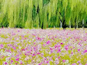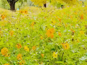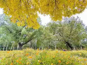 The sea of flowers made up of cosmos and coreopsis is still flourishing! The golden divine tree perfectly collides with the colorful flower sea, truly breathtaking~