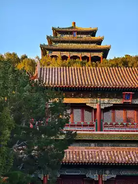 The weather was clear and fine, so we went to climb Jingshan. Get off at Tian'anmen East Subway Station, cycle to the Northeast Corner Tower of the Forbidden City, then walk along the Golden Water River to Shenwu Gate. After passing through the underpass, enter Jingshan Park with a 2 yuan ticket. Tour the Five Pavilions of Jingshan from east to west, and from Wanchun Pavilion, overlook the cityscape of Beijing in all four directions. After descending the mountain and exiting Jingshan South Gate, it happened to be sunset, with the afterglow illuminating Shenwu Gate. We continued along the Golden Water River to the Northwest Corner Tower, by which time the sun had already set.