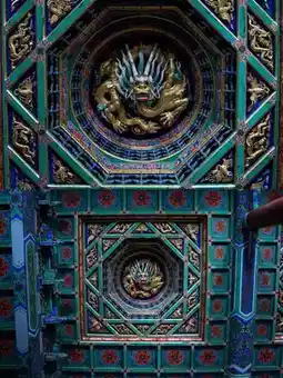 Looking up, the ceiling is magnificent, with three side-by-side coiled dragon caisson ceilings.