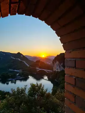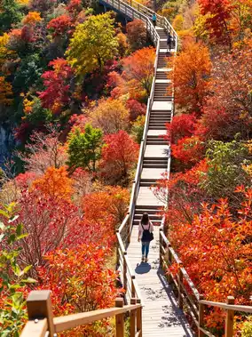 The Water Great Wall in autumn is stunningly vibrant. The trees on the mountains seem to be freely painted by nature’s artist. The fiery red maple leaves burn like flames, sparkling brilliantly under the sunlight. The golden ginkgo leaves resemble delicate little fans, dancing gently in the wind and slowly falling, as if a golden rain is pouring down. The lush green pines and cypresses stand even taller among the red and yellow autumn leaves, adding a calm undertone to this autumnal painting.