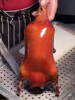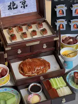 • Underneath, there’s perfectly sliced duck meat with scallions, cucumber, and hawthorn strips — ready to wrap in thin pancakes with a dab of sweet sauce.