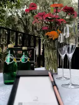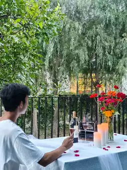 The breeze on the terrace is a pre-written love poem: white gauze drapes the table corner, candlelight flickers softly beside the bouquet, and when rose petals scatter along the table edge, the gentle pop of the bottle opening becomes the prelude to a confession. His silhouette pouring wine is cut tenderly by the leaves.
