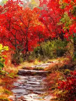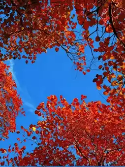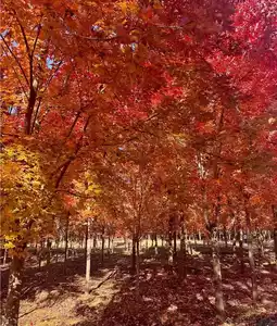 2. Vibrant red leaves! Straight maple trees adorned with deep red leaves, glowing like torches under the sunlight.