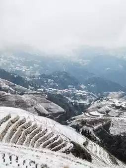 Guangxi’s mountains and waters lose their humid mist in autumn and winter, becoming clearer and purer—in the bright late autumn, you have the chance to see the Longji Terraces faintly appearing in the sea of clouds at dawn, or watch the sunset glow dye the exposed ridges of the terraces warm gold, contrasting sharply with the dark distant mountains; after winter arrives, you can witness the dreamlike scenery of sky and cloud reflections on the flooded terraces, or even snow-covered terraces and villages transforming into a fairy tale world.