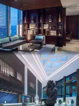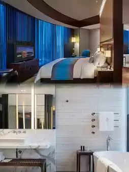 Starting at 55㎡ for the deluxe rooms, the smart mattress and projector are a lazy person’s dream. The bathroom has a double sink design, and the amenities are a custom series with sandalwood scent. My favorite spot is the Zen tea area by the floor-to-ceiling window, where the palace lanterns light up at night creating a full ambiance.
