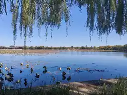 The pair of black swans, the boats gliding across the lake, and the visitors on the shore all breathe life and warmth into this still poetic scene.