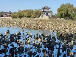 By the water’s edge, with withered lotus leaves and drooping willow branches, the mirror-like water reflected the colorful autumn hues, evoking a classical mood of “listening to the rain on withered lotus leaves,” peaceful and profound.