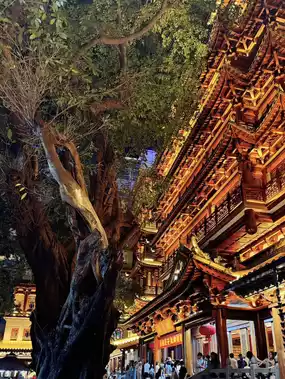 Street food vendors lined the way, tempting me with the irresistible aroma of grilled skewers, sweet tofu pudding, and sugar-coated hawthorn sticks. I couldn’t resist grabbing a snack and enjoying it while watching the hustle of daily life unfold—shoppers browsing, kids playing, and elders chatting under the soft glow of lanterns.