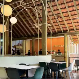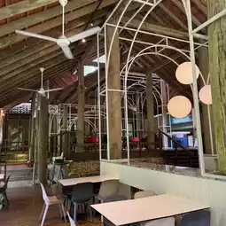 Rustic wooden interiors, high ceilings, and large windows reveal lush greenery and a serene pond just outside. Seating ranges from cozy corner benches to long communal tables—perfect whether you’re solo or with friends .