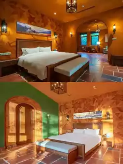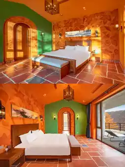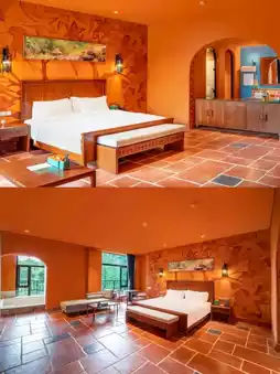 The hotel is tucked away in Hubao Village, Caohezhuang Town, just a 5-minute walk from the Azalea Geological Wonder Park! It takes only 1.5 hours by car from Shenyang city center to reach this hidden gem, and the red leaf tunnel along the way is already worth the fuel 🛣️