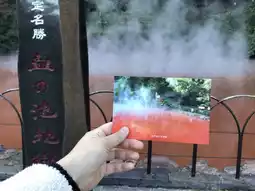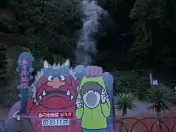 This hot spring is also recommended for children, as it has a sign showing the destination when an explosion occurs, and a face-in panel for commemorative photos!