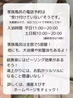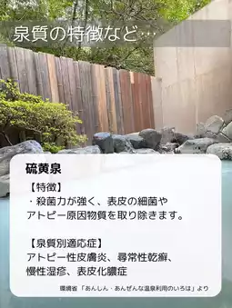 *After you get out of the bath, the scent of the hot spring will remain on your body. It will also transfer to your clothes, so please be careful if you are wearing your favorite clothes.