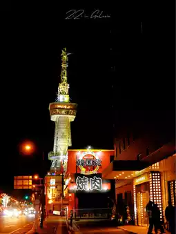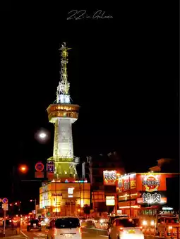 I walked closer to the tower and looked up at it, only to see it towering into the clouds and looking majestic. The spire appears and disappears in the night sky, as if reflecting with the stars, weaving a mysterious pattern of the night sky. The surrounding buildings also lit up, echoing the Beppu Tower and creating a solemn and sacred atmosphere.