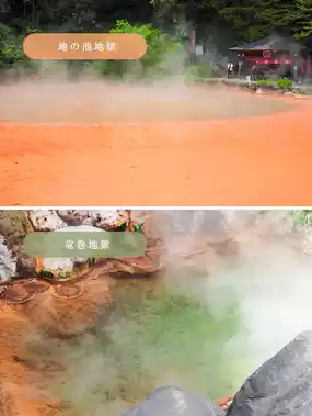 🏷 Details of the hells 🏷🌊 Sea Hell 🌊 Sea Hell is like a garden. We also recommend viewing the azaleas in spring! The main attraction is the beautiful cobalt blue hell! 📍: 559-1 Kannawa, Beppu City, Oita Prefecture, 874-0000 ⏰: 8:00-17:00 🚗: Free parking ☕️: Cafe available 👹 Kamado Hell 👹 Hells where you can enjoy the sights of the Blood Pond Hell, Sea Hell, and Onishibozu Hell. You can also sample the hot springs 🚰 📍: 621 Kannawa, Beppu City, Oita Prefecture, 874-0840 ⏰: 8:00-17:00 ☕️: Cafe available ♨️: Foot bath available 🐟 Shiraike Hell 🐟 Depending on the season, it turns green with algae. (Unfortunately, it was green) You can see rare giant tropical fish at the tropical fish museum next door. 📍: 283-1 Kannawa, Beppu City, Oita Prefecture, 874-0045⏰: 8:00-17:00