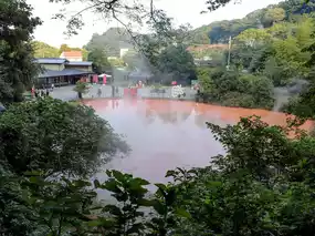 Japan's oldest natural hell where bright red hot mud gushes out.